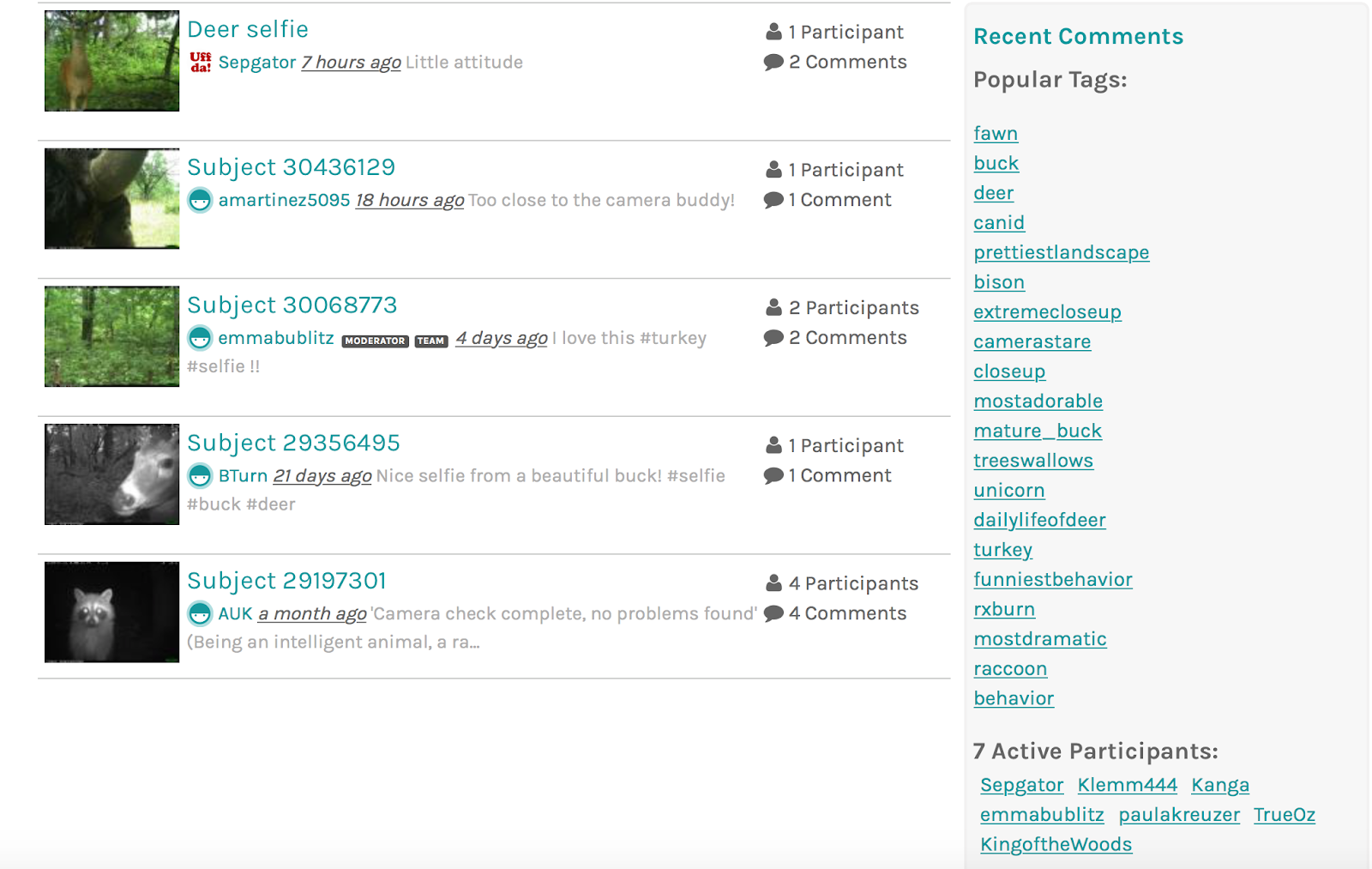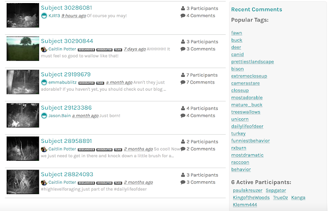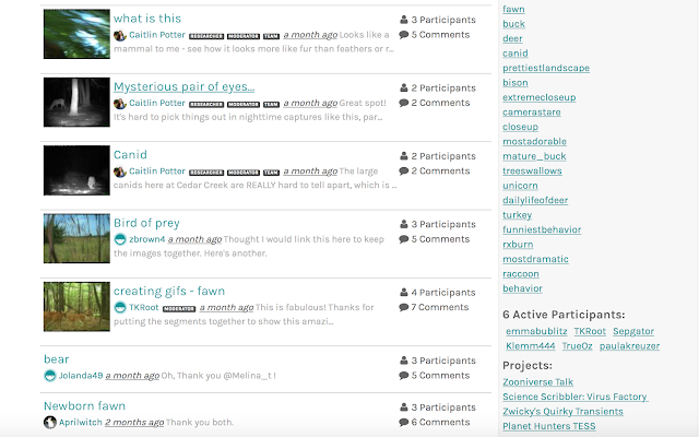 The Project Discussion board is a good place to share any especially interesting photos that you come across while classifying, ones that you want others to be able to easily find and appreciate (the images in the Notes board get buried QUICKLY!). This is where we highlight interesting trends (such as the doe and her newborn fawn) and it has also been a hot spot for sharing GIFs of interesting sequences.
